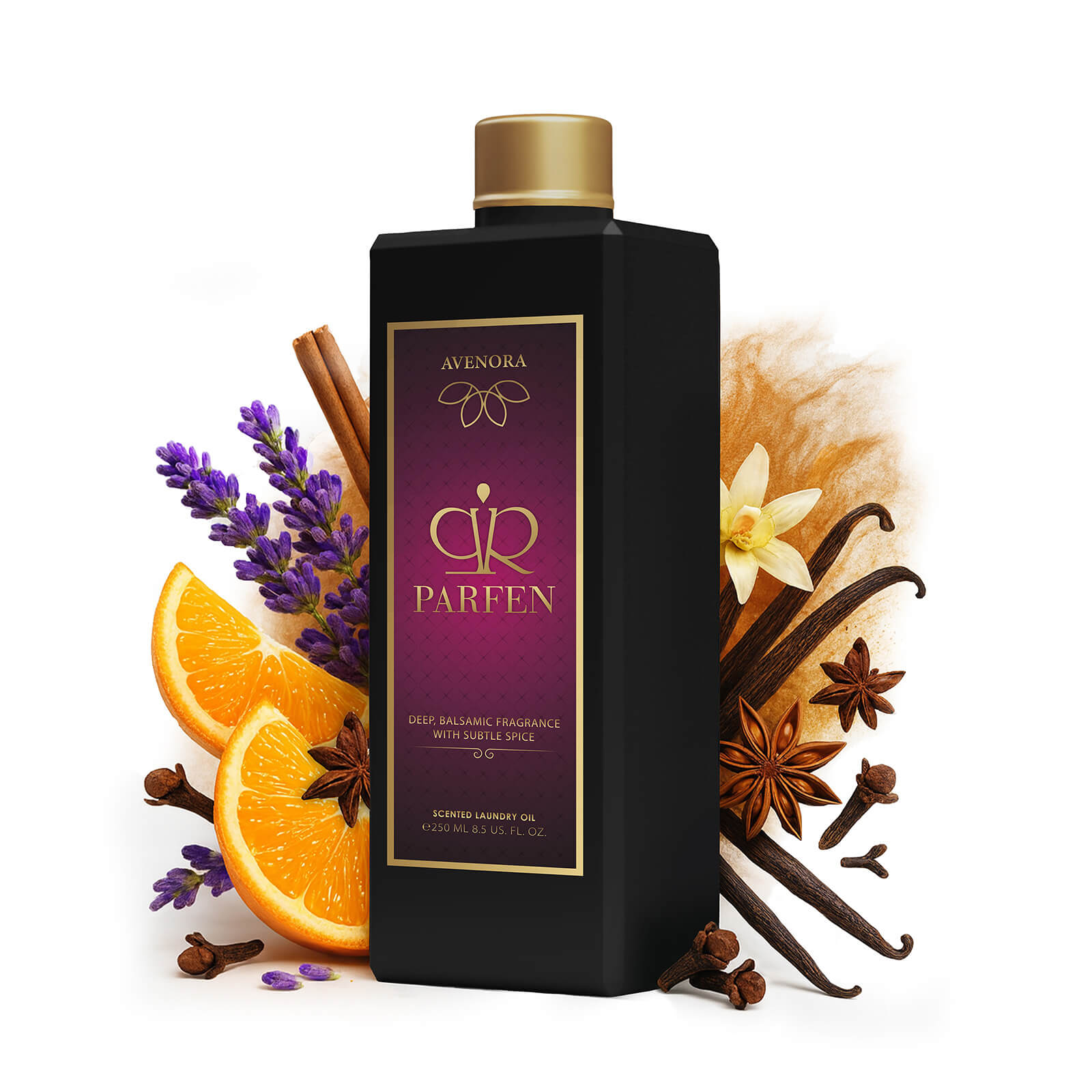 Das Wäscheparfüm AVENORA kombiniert Noten von saftigen Zitrusfrüchten, Reinheit von Lavendel und einen orientalischen Hauch von Gewürzen. Nach dem Waschen hinterlässt es an der Kleidung einen frisch-orientalischen Duft. Direkt, nachdem Sie die Wäsche aus der Waschmaschine herausnehmen, nehmen Sie einen sehr intensiven und einzigartigen Duft wahr. Nach und nach wird das Aroma sanfter, und auf der Wäsche verbleibt ein langanhaltendes frisch-samtiges Aroma, das Sie noch Wochen nach dem Waschen riechen werden.